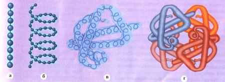 Рис.2. Уровни структурной организации белков: а) - первичная структура - линейная последовательность аминокислот (образование полипептидов); б) — вторичная структура - образование спирали из полипептидной цепи или β-структуры; в) - третичная структура - образование глобулы из полипептидной спирали и β-структуры; г) - четвертичная структура - образование белкового комплекса, состоящего из нескольких полипептидных глобул