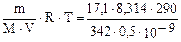 Пример 13. Определите осмотическое давление при 17 °С раствора, в 500 мл которого содержится 17,1 г сахара С12H22O11. Решение. Молярная масса сахара равна 342 г/моль, температура раствора равна 290 К. Осмотическое давление раствора вычисляем по уравнению Вант-Гоффа: