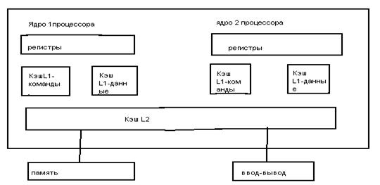 Многомашинные МКМД Многомашинные системы - это системы, включающие 2 и более ЭВМ, каждая из которых имеет свои память, периферийные устройства и операционную систему. По характеру связей они делятся на слабосвязанные, прямосвязанные и сателлитные. В слабосвязанных системах ЭВМ связаны только через внешние ЗУ, а связь осуществляется только на информационном уровне. Обмен информацией осуществляется по принципу «почтового ящика». Каждая ЭВМ помещает в общую внешнюю память информацию, руководствуясь собственной программой, а другая ЭВМ принимает эту информацию исходя из своих потребностей. Такая организация применяется, когда необходимо повысить надежность путем резервирования. Прямосвязанные системы отличаются большей гибкостью. В них существует три вида связей: через общее ОЗУ, прямое управление процессор-процессор, и связь через адаптер канал-канал. Связь через общее ОЗУ сильнее, чем через внешнее ЗУ, все процессы протекают быстрее, но при выходе из строя ОЗУ нарушается работа всей системы.Связь процессор-процессор может быть не только информационной, но и командной, т.е. по каналу прямого управления один процессор может непосредственно управлять работой другого. Контроль получается более полным, но в это время прекращается решение задач. Связь через адаптер связывает каналы ввода-вывода, что обеспечивает быстрый обмен большими объемами информации. Сателлитная связь характеризуется не способом связи, а принципами взаимодействия ЭВМ. В сателлитных ВС ЭВМ не одинаковы и одна подчиняется другой. Основная ЭВМ мощная и предназначена для решения основной задачи. Вторая ЭВМ, вспомогательная, организует обмен данными. Такая связь не увеличивает надежность, но увеличивает производительность работы. Многопроцессорные ВС – это системы, включающие 2 и более процессоров, работающих под управлением одной операционной системы, и имеющие общее ОЗУ и периферийные устройства. Из рассмотренной классификации ВС видно, что фон-неймановский компьютер является частным случаем системы ОКОД. Возможные усовершенствования в рамках этой архитектуры ограничиваются включением в нее конвейеров и других функциональных узлов, а также использование разных методов кэширования. Две другие архитектуры были реализованы в нескольких проектах, но не стали массовыми. Единственным путем преодоления ограничений архитектуры фон-Неймана (бутылочного горла) остается развитие архитектуры МКМД. В этих ВС может быть много подходов, это могут быть и кластерные архитектуры и многопотоковые процессоры. Одной из характерных особенностей МКМД является параллельная обработка информации. Таким образом многопотоковые процессоры являются разновидностью ВС класса МКМД, и в частности, многопроцессорных систем. В литературе многопроцессорные системы, построенные на основе процессоров, имеющих несколько ядер,(ядро – это АЛУ и УУ), называются CMP (Chip MultiProcessor) – мультипроцессорами. Первые СМР процессоры предназначались для серверного рынка и представляли два независимых суперскалярных процессора на одной подложке, как показано на рис.1.2.5.