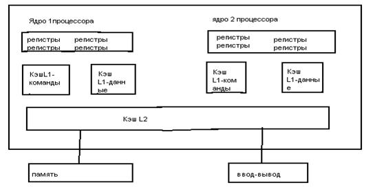 Рис.1.2.5 Простейшая версия СМР Такая архитектура позволяет уменьшить объем, в одном кристалле можно упаковать больше процессоров, что повышает удельную мощность. Обычно в этом случае между процессорами имеется лишь общий системный интерфейс. Достоинство СМР – заменяя одноядерный процессор двухядерным, можно при той же производительности вдвое уменьшить тактовую частоту, сократить потребление. Логически оправдан следующий шаг: собрать несколько ядер и объединить их общей кэш-памятью. Это было реализовано в проекте Hydra (рис.1.2.6)