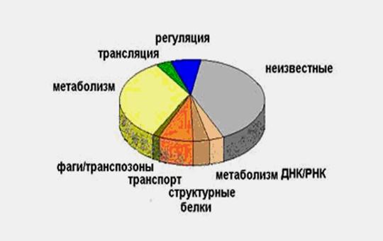 Рис.28. Распределение функций генов Е.cоli, выявленное по полной нуклеотидной последовательности генома