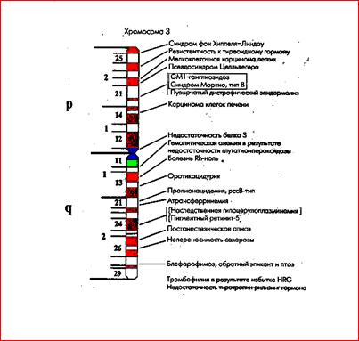 На данном рисунке представлены три фрагмента последовательностей от двух индивидов. В прямоугольниках выделены однонуклеотидные различия в геномных последовательностях. ОНП — наиболее общий источник вариаций между людьми. Эти вариации встречаются на протяжении всей ДНК (в экзонах, интронах, межгенных промежутках, повторах) и отражают прошлые мутации. Секвенированием геномов или их частей разных людей установлено, что однонуклеотидные различия обнаруживаются на протяжении 1000—2000 нуклеотидной длины. Это означает, что на всю длину генома (3,2 млрд пар нуклеотидов) должно быть 1,6—3,2 млн ОНП. К 2001 г. идентифицировано и картировано 1,42 млн ОНП. Расчёты показывают, что два человека на 99,9% идентичны по нуклеотидным последовательностям, т.е. только 0,1% различий по одному нуклеотиду создаёт такие огромные индивидуальные фенотипические вариации, которые легко видеть в любой группе индивидов. Предполагают, что различия по одному основанию между определёнными отрезками геномов лежат не только в основе генных болезней (миссенс-мутации), но и в основе чувствительности к возбудителям или защиты от них, в основе приспособительных реакций и наследственного предрасположения к мультифакториальным болезням. К началу 2001 г. идентифицировано 60 000 ОНП в генах (их называют кодирующими ОНП). Это означает, что в генных последовательностях один кодирующий ОНП встречается в пределах 1080 пар нуклеотидов. Хотя информация об ОНП ещё не полная (основные сведения получены в последние 2 года), уже известно, что 93% генов содержат ОНП. Главное использование карты ОНП — выяснение вклада индивидуальных генов в болезни комплексной (многофакторной) и полигенной природы. Сравнение частот определенных типов ОНП у пациентов и в контрольных группах позволяет идентифицировать ОНП, с которыми ассоциируется заболевание. Несмотря на большие перспективы, которые открываются для объяснения заболеваний человека с пониманием природы и размаха ОНП, необходимо помнить об опасности геномомании. Гены и геномы действуют не в вакууме. Среда не менее важна для биологии человека, чем гены. Карты ОНП при правильном использовании позволяют лучше понять роль природы (генотипа) и среды в широком понимании в развитии человека в целом и патологии в частности. Генетические карты. Составной частью сведений о геноме человека наряду с нуклеотидной последовательностью являются генетические карты хромосом, т.е. схемы, описывающие порядок расположения генов и других генетических элементов на хромосоме с указанием расстояния между ними. Генетическое расстояние измеряется по частоте рекомбинации между гомологичными хромосомами и выражается в сантиморганидах (сМ). Одна сМ соответствует частоте рекомбинации, равной 1%. Длина всего генома человека равна примерно 3000-3500 сМ.