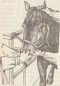 Перед введением зонда строптивых лошадей фиксируют за уши, губу или накладывают закрутку. Зонд для лошадей представляет собой эластичную резиновую трубку длиной 160—225 см, наружным диаметром 18 мм и внутренним просветом 12—14 мм. Вводят его через носовые ходы (рис. 15). Перед этим зонд проверяют на проходимость воды, дезинфицируют и затем смазывают вазелином. Для определения местонахождения на зонде делают пометки: первая — показатель расстояния от крыла ноздри до глотки (измеряют зондом непосредственно на голове животного), вторая — примерное расстояние от носового отверстия до желудка (15-е и 16-е ребра слева). Вводимый конец берут пальцами левой или правой руки, в зависимости от того, в какую ноздрю вводят зонд, а свободный конец поддерживает помощник. При введении в левую ноздрю помощник и оператор стоят справа. Во избежание ушибов не следует стоять спереди животного. В момент введения ладонью левой руки надавливают на стенку носа, средним пальцем этой же