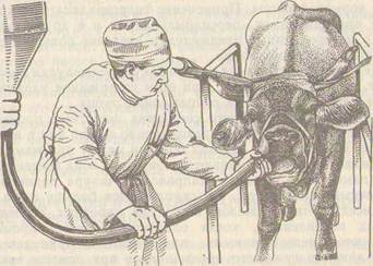 Рис. 17. Схема использования аонда Г. М. Даценко для промывания рубца и введения лекарственных веществ.