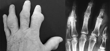 Рис. 3-4. Многочисленные крупные тофусы на пальцах кистей; та же кисть на рентгенограмме.