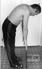 Наиболее постоянными клиническими признаками являются боли в нижней части спины (поясничная область, область крестца, таза) воспалительного характера, скованность (уменьшается при движении) и нарушения функции позвоночника (во всех направлениях); иногда могут преобладать боли в области крестца и ягодиц (сакроилеит), иррадиирующие в поясницу и проксимальные отделы бёдер. Типичен восходящий характер поражения позвоночника. Скорость распространения болей и ограничений движений на грудной и шейный отделы различна. В большинстве случаев это происходит медленно, в течение нескольких лет. Со временем формируются стойкие ограничения движений во всех отделах позвоночника и, что особенно неблагоприятно, кифотические (сгибательные) деформации грудного («поза просителя»), шейного отдела, пояснично-крестцового. Для определения подвижности позвоночника существуют ряд тестов. Исследование симптомов Томайера и Шобера позволяют оценить подвижность поясничного отдела, а изменение дыхательной экскурсии грудной клетки – подвижность реберно-позвоночных суставов в грудном отделе позвоночника. Симпотом Томайера: больной наклоняется вперед и пытается достать пол вытянутыми пальцами рук, сомкнув ноги вместе и не сгибая их в коленных суставах. В норме расстояние между кончиком среднего пальца и полом составляет 0-10 см, а при болезни Бехтерева существенно больше (рис. 6-5). Симптом Шобера: при наклоне больного вперед измеряют, насколько увеличилось расстояние между заранее отмеченными двумя точками – первая из них соответствует месту пересечения оси позвоночника с линией. соединяющей боковые углы ромба Михаэлиса, вторая располагается на 10 см выше первой. При полном сгибании в норме это расстояние увеличивается не менее чем на 4-5 см, чего не наблюдается при болезни Бехтерева. Дыхательную экскурсию грудной клетки измеряют на уровне четвертого межреберья на высоте вдоха и выдоха. Разность между полученными цифрами в норме не должна быть меньше 5-6 см.