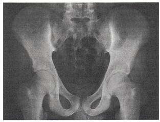 Рентгенография суставов. Поскольку первые изменения всегда формируются в области крестцово-подвздошных сочленений, в случае подозрения на АС в обязательном порядке выполняют рентгенограмму таза в передне-задней проекции, захватывающую все кости таза и тазобедренные суставы. Ранний признак сакроилеита — сочетание участков расширения суставной щели за счёт эрозий на фоне распространённого субхондрального остеосклероза, сначала со стороны подвздошной кости, а затем и со стороны крестца. Очаговое, а затем полное анкилозирование крестцово-подвздошных сочленений, а также сужение щелей этих суставов — поздние признаки сакроилеита (рис. 6-6).