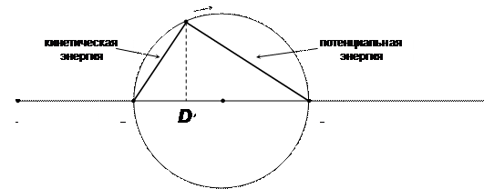 Наш «маятник» состоит из массы (размещен на тележке, которая катается без трения) и соединен с пружиной, которая обладает жесткостью K. В начальном положении сила натяжения-сжатия пружины равна нулю. Оттянем пружину до некоторой отметки на оси F, т.е. сообщим системе некоторое количество энергии, которое и будет «свободной» энергией. Отпустим тележку — она начнет совершать гармоническое колебание около положения равновесия. Общая и свободная энергия (из-за отсутствия диссипации) будут сохраняться, а «потенциальная» и «кинетическая» энергия будут переходить друг в друга. При этих взаимных переходах представляющая точка D будет перемещаться на отрезке 1—3. Теперь мы должны «отождествить» наши точки 2 и 3 с точкой D; будем считать, что точка D находится в точке B,когда свободная энергия является «потенциальной» энергией; когда точка D находится в точке 3, то вся свободная энергия является «кинетической». Считая «кинетическую» и «потенциальную» энергию «компонентами» свободной энергии, мы можем рассматривать свободную энергию как векторную сумму своих компонент. Поскольку угол между кинетической и потенциальной энергией — прямой, а свободная энергия — постоянна — инвариант, то представляющая точка D будет описывать окружность (рис. 3.5).