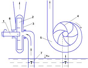 Рис.10.1 Рабочее колесо с корпусом образуют спиральную камеру 5, которая затем плавно переходит в короткий диффузор, образующий напорный патрубок, соединяемый с напорным трубопроводом. Между валом и корпусом предусмотрено уплотнение 6. Рассмотрим принцип действия центробежного насоса (рис.10.1). Так как вход и выход этого насоса между собой постоянно сообщаются, то насос принципиально не способен создать достаточное разрежение для его заполнения жидкостью, поэтому перед пуском насоса в работу последней должен быть заполнен перекачиваемой жидкостью. Для возможности заполнения во всасывающей трубе для малых насосов предусматривается обратный клапан 7, а для более крупных, в которых клапаны отсутствуют, – вакуумирование. При вращении рабочего колеса на каждый объем жидкости, находящейся в межлопастном канале, действует центробежная сила, под действием которой жидкость выбрасывается из рабочего колеса в спиральную камеру; так как жидкость является сплошной средой без пустот и переуплотнений, то начиная с центра рабочего колеса, жидкость перемещается непрерывными потоками в межлопаточных пространствах, наращивая в основном кинетическую энергию, которая сначала в спиральной камере, затем в диффузоре превращается в потенциальную энергию, т.е. растет давление. Несмотря на простоту конструкции центробежного насоса, движение жидкости внутри него, особенно в межлопастном пространстве, довольно сложное. Для объяснения движения жидкости в рабочем колесе насоса существуют две теории. Первая – вихревая (теория Н.Е. Жуковского). Суть ее заключается в том, что лопасть рабочего колеса, при обтекании которого возникает подъемная сила, заставляющая перемещать жидкость внутри колеса (рис.10.2)
