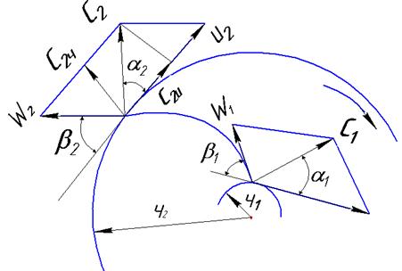 Рис.10.2 Вихревая теория более приемлема для объяснения работы осевых насосов и менее удобна для центробежных. Вторая – струйная (теория Л.Эйлера). Суть этой теории заключается в том, что сложное движение жидкости внутри рабочего колеса насоса идеализируется и принимается строго упорядоченным – струйным. Для этого рабочее колесо должно иметь бесконечно большое число бесконечно тонких лопастей. для такого упорядоченного движения жидкости можно представить параллелограммы скоростей на входе и выходе лопастей (рис.10.3) с индексами «1» - на входе и «2» - на выходе. Для этого выделим только одну лопасть (рис.10.3).