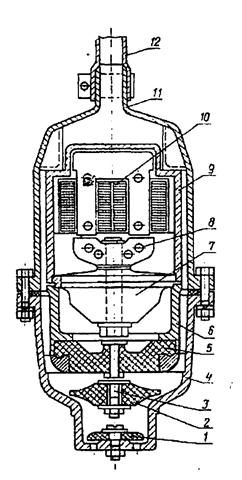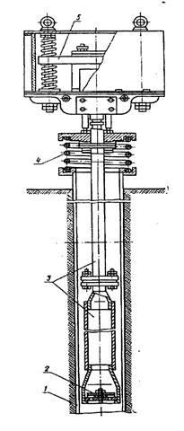 Вибрационные насосы (по ГОСТу) относятся к насосам трения, в которых жидкая среда перемещается в процессе возвратно–поступательного движения. В них используются инерционные свойства поднимаемой жидкой среды. Рабочим органом является клапан–поршень, имеющий возвратно–поступательное движение и приводимый в действие механическим вибратором. Поднимаемой жидкости сообщаются колебательные движения путем создания клапаном–поршнем попеременных усилий сжатия и разрежения, благодаря чему в жидкости возникают инерционные силы и она поднимается. Имеется несколько типов насосов, отличающихся конструктивным устройством. по расположению вибраторов различают насосы с погружным и поверхностным вибратором. Вибрационный водоподъемник с погружным вибратором представлен на рис. 10.29. При нормальной работе насос подает 1 м3/ч воды при напоре 20 м. Максимальный напор 30 м при подаче 0,15…0,20 л/с, максимальная подача 0,9 л/с при напоре 1 м, максимальная мощность насоса 250 Вт. Вибрационный водоподъемник с поверхностным вибратором показан на рис.10.30. источником колебания служит электромагнитный вибратор, питаемый от однофазной сети переменного тока 220 В (50 Гц) через селеновый выпрямитель. Подача насоса 1 л/с при напоре 25 м, частоте колебаний 3000 в минуту и потребляемой мощности 700 Вт.