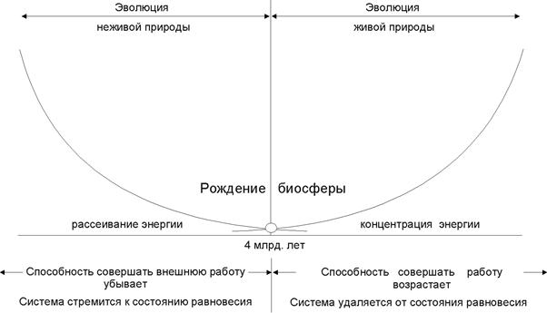 Можно было бы допустить, что после того, как некоторая часть лучистой энергии перешла в потенциальную форму энергии живого вещества на поверхности нашей планеты, то процесс дальнейшего накопления этой энергии будет остановлен. Однако, биогеохимический анализ эволюции живого вещества (включая человеческую популяцию) показывает, что такой тенденции по ходу эволюции не обнаруживается. За четыре миллиарда лет эволюции «процесс жизни не только не обнаруживает тенденции затухания, а, наоборот, охватывает все большую и большую часть вещества биосферы». Не исключено, что был момент, когда количество живого в биосфере было минимально, а теперь 1015 т, имеет место «прогрессирующее увеличение свободной энергии живого вещества при сохранении общей массы биосферы (включая косное вещество)» (В.Вернадский).