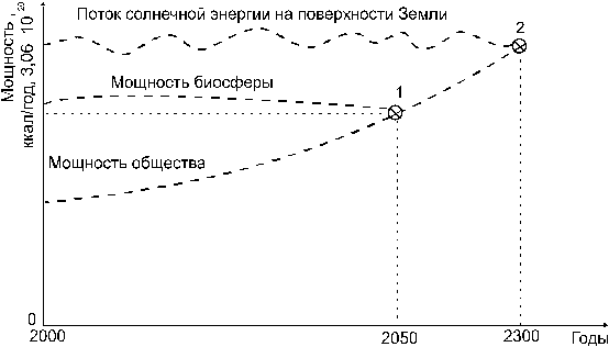 К настоящему времени между Человечеством и природой сложилась противоречивая ситуация. С одной стороны Человек стал мощной геологической силой. С другой стороны, происходит все большее загрязнение окружающей Человека среды, что приводит к замедлению роста ее полезной мощности. Налицо рассогласование в темпах роста потоков свободной энергии человечества и живого вещества (без человека). Если эта ситуация сохранится, то в будущем следует ожидать критический период третьего рода. Оценим его возможную дату. По оценкам (Hubbert М.К. The energy resources of the earth. Scientific American, 1971, Nо. 5, рр. 61—70), общая величина потока солнечной энергии, попадающая на плоскость большого круга нашей планеты составляет Около 30% потока этой энергии ( Только 25% солнечного света, достигающего поверхности Земли, имеют длины волн, стимулирующие фотосинтез и потому лишь 25% его в действительности используется зелеными растениями. Для любого года, отстоящего от настоящего момента времени