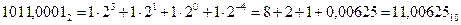 1) Вычисляем значение выражения в десятичной системе счисления: 7,9 ´ 3 – 12,6 = 11,1 2) Переводим первое число Число 7,9 содержит целую часть (7) и дробную часть (0,9). Для перевода целой части используем метод перевода целых чисел из десятичной системы счисления в двоичную. Согласно ему целое число делится на два нацело с записью целого частного и остатка от деления. Каждое полученное целое частное вновь делится на два до тех пор, пока частное от деления не станет равным нулю. Остатки от деления, записанные в порядке, обратном их получению, представляют искомое двоичное число. Для перевода дробной части используем метод перевода дробных чисел из десятичной системы счисления в двоичную. Согласно ему цифры дробной части умножаются на два с раздельной записью целой и дробной частей произведения. Дробные части произведений вновь умножаются на два по тому же правилу до тех пор, пока дробная часть очередного произведения не станет равной нулю, либо пока не будет вычислено заданное количество дробных двоичных цифр. Целые части произведений, записанные в порядке их получения, представляют цифры искомой двоичной дроби. Выполним рассмотренные действия для нашего числа