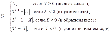 Как видно из формулы (2), во всех кодах – и прямом, и обратном, и дополнительном хранимые положительные числа представляются таким образом, что арифметическое значение U двоичного машинного кода совпадает с хранимым значением Х. Несложно догадаться, как получается двоичный машинный код неотрицательного числа – двоичное представление числа дополняется слева незначащими лидирующими нулями до k разрядов – длины ячейки памяти ЭВМ. С кодами отрицательных чисел несколько сложнее. В общем случае формулу генерации кода можно получить из формулы (2):