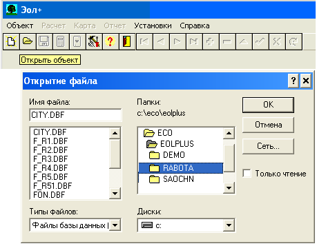 Для открытия объекта необходимо выбрать пункт меню «Объект/Открыть». В появившемся на экране стандартном диалоговом окне для открытия файла с заголовком «Открыть объект» необходимо выбрать диск, на котором находится каталог отрываемого объекта, а в левом списке – один из файлов, в которых хранятся данные Каталог объекта содержит семь основных файлов базы данных объекта: CITY.DBF - данные о географической привязке и метеоусловиях города (региона), где расположено предприятие; PROM_PL.DBF - данные о промплощадках; SUBSTAN.DBF - характеристики загрязняющих веществ, которые выбрасывает предприятие; GR_SUMM.DBF - характеристики групп веществ однонаправленного действия;