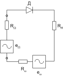 При анализе работы всех ПЧ будем считать, что они работают в режиме больших амплитуд (РБА), т.е. выполняется неравенство: Еω> > Е Для исследования спектрального состава тока на выходе ПЧ принимают: еw = Еwcos wt, е = iд = а0 + а1 Uд + а2 U2д + а3 U3д. Таким образом, на выходе ПЧ спектр выходного тока будет определяться выражением ( Простейший преобразователь частоты вносит затухание в модулированный сигнал как минимум: ар = 10 дБ. Основным недостатком простейшего ПЧ является наличие несущей частоты на выходе схемы. Схеме простейшего пассивного ПЧ и временные характеристики тока и напряжения в разных точках схемы представлены на рисунке 7.
