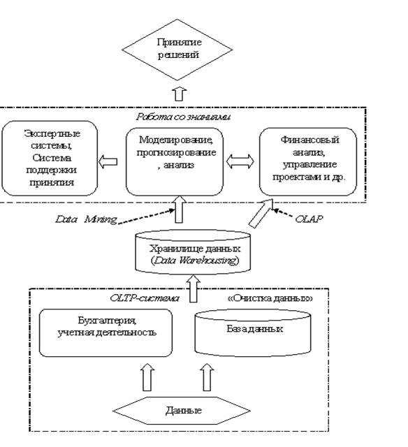 ТЕМА 2. МЕТОДЫ ОБРАБОТКИ ДАННЫХ Информационная система предприятия предназначена для работы с двумя основными видами информации: данными и знаниями. Напомним, что под данными понимают сведения о конкретных значениях каких-либо параметров. Например, адрес поставщика, количество товара, перечень комплектующих, услуг и т.д. Как правило, данные о какой-либо предметной области сводятся вместе в форме таблиц. Такие таблицы могут быть достаточно большими и содержать десятки тысяч и даже миллионы записей. Наборы таблиц, в которых собрана информация о деятельности социально-экономического объекта (предприятия, учреждения, вуза, общественной организации и т.д.) составляют основу современных баз данных. Системы компьютерной поддержки таких баз данных называются системами управления базами данных (СУБД). Знания – это сведения о закономерностях какой-либо предметной области. Они представляют собой отношения между данными или другими знаниями и представляются в виде выводов, обобщений, формул, правил, схем, моделей, в том числе и мысленных и др. Знания о какой-либо предметной области могут быть собраны вместе в базе знаний. Такая база знаний вместе с правилами вывода новых знаний в зависимости от ее масштабов, особенностей работы со знаниями и назначения называется экспертной системой, советующей информационной системой или системой поддержки принятия решений. Существует определенная взаимосвязь между способом представления информации и ее видом. Например, схемы и тексты однозначно относятся к знаниям. Но для числового и символьного (небольшой текст, не обязательно имеющий общепринятый смысл) представлений эта зависимость более размыта, и отнесение такого рода информации к данным или знаниям зависит от схемы, в которой она используется. С практической точки зрения из всего многообразия видов информации и методов работы с нею целесообразно выделить следующие три случая: - данные и методы работы с ними; - методы извлечения знаний из данных; - знания и получение новых знаний. На рис.2.1 показана схема обработки информации в ИСП и даны общепринятые названия этапов и методов обработки. Последовательность обработки информации на этой схеме увязана с ее движением в системе управления предприятием, приведенной на схеме 1.1. На нижнем уровне ИСП находится система работы с данными или другое ее название – система обработки транзакций (OLTP – Online Transaction Processing). Данные о деятельности предприятия и его окружении поступают в базу данных или в программные продукты для обработки данных, включая бухгалтерские и иные программы, с помощью которых можно осуществлять учетную деятельность. Между учетными программами и базой данных возможен двусторонний обмен информацией. С одной стороны, база данных может пополняться из учетных программ, с другой стороны, учетные программы могут использовать информацию, содержащуюся в базе данных. Непосредственное использование информации из базы данных для высших уровней обработки информации, оперирующих в основном знаниями, не совсем удобно (см. об этом детальнее в следующих разделах), поэтому «очищенная» (упорядоченная и согласованная) информация из базы данных передается для хранения и дальнейшего использования в хранилище данных (Data Warehousing). В свою очередь, информация из хранилища данных может быть использ