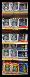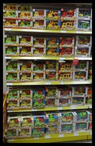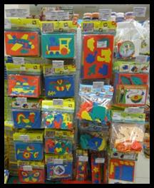 Наборы для творчества группируются по принадлежности (Вязание, вышивка, самолеты и т.д.) и выставляются с учетом цены – от дешевого товара к дорогому, слева направо. Выкладка «змейкой».