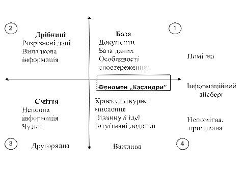 Трикутники прийняття рішень Наведений рисунок ілюструє різні стилі прийняття рішень: збалансований (1), логічний (2), прагматичний (3) та інтуїтивний (4). У міжнародному менеджменті найбільш поширеним є інтуїтивний стиль прийняття управлінських рішень, оскільки він дозволяє враховувати особливості національних культур. Це пояснюється також особистою характеристикою здібних до міжнародного бізнесу менеджерів, які роблять наголос більше на відчуттях і враженнях, ніж на фактах і інформації. Особливість інформаційного забезпечення процесу прийняття міжнародних рішень полягає у тому, щоб використати всю релевантну інформацію, тобто ту, що стосується даної проблеми. Складність однак, полягає, в тому, що не вся релевантна інформація помітна. Досвід показує, що через різницю культур автори проектів рішень можуть випускати з поля зору корисну інформацію, що помітна представникам іншої культури. У цьому зв'язку доцільно враховувати так званий феномен «Касандри», зображений на стику сегментів «Важлива», «Помітна», матриці, представленої на рис. 4.2.
