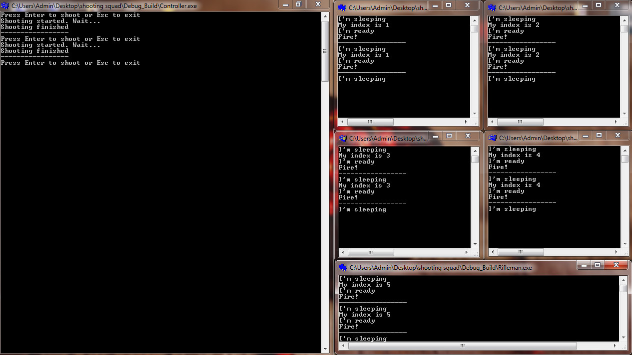 · В данном фрагменте кода создается процесс «стрелки»: int main(int argc, char* argv[]) { hWatchdog = CreateSemaphore(NULL, 0, 1, "watchdog"); // запускаем процессы стрелков for(int i = 0; i < COUNT; i++) { processes[i] = startProcess(i); } · Создание процесса «офицер»: PROCESS_INFORMATION startProcess(int index) { std::stringstream ss; ss << "Rifleman.exe " << index << " " << COUNT; STARTUPINFO cif; ZeroMemory(&cif,sizeof(STARTUPINFO)); PROCESS_INFORMATION pi; CreateProcess(NULL, (LPTSTR)ss.str().c_str(), NULL, NULL, FALSE, CREATE_NEW_CONSOLE, NULL, NULL, &cif, &pi); return pi; } · Взаимодействие двух процессов – «офицер» и «стрелки»: HANDLE hFirstRiflemanSemaphore = OpenSemaphore(SEMAPHORE_ALL_ACCESS, FALSE, "rifleman0"); ReleaseSemaphore(hFirstRiflemanSemaphore, 1, NULL); · Уничтожение процесса «стрелки»: for(int i = 0; i < COUNT; i++) { // завершаем процессы стрелков TerminateProcess(processes[i].hProcess, NO_ERROR); } return 0; · Уничтожение процесса «офицер»: while (1) { ... else if (GetAsyncKeyState(VK_ESCAPE)) { break; }