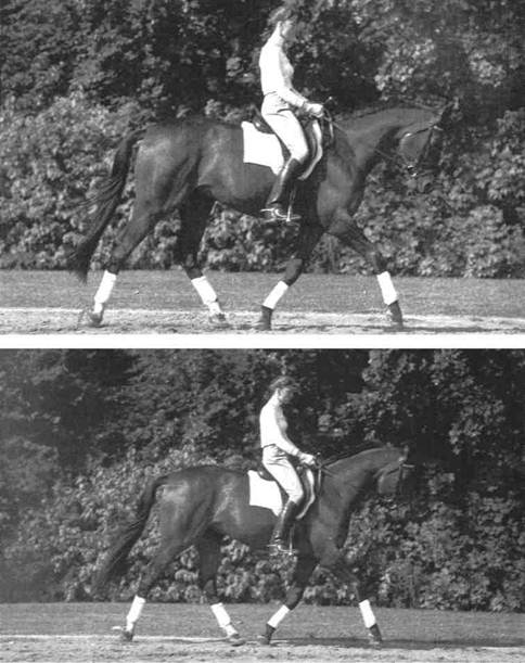 ставьте себе еще раз, как вы равномерно нагружаете обе ноги (не прогибать колени!) и закрываете глаза. Тогда вы почувствуете, что не стоите неподвижно, а все ваше тело постоянно колеблется над ногами. Вам приходится снова и снова восстанавливать равновесие. Это происходит полностью автоматически, минимальными движениями, благодаря четко согласованному гармоничному взаимодействию мышц. Как этому можно научиться? Понаблюдайте еще раз за детьми, они демонстрируют поистине самый естественный путь для обучения движениям. Ребенок, который учится бегать по прямой, может бежать, но ему трудно стоять спокойно на одном месте. Для нашей мускулатуры проще двигаться, чем регулировать равновесие в стоячем положении. Следовательно, развитие происходит постепенно от движения к выработке осанки, причем осанка рассматривается как минимальное, но все же движение. Итак, не стоит сразу требовать от начинающего всадника правильной осанки на лошади. Неподвижное положение приводит к ригидности. Чтобы добиться улучшения осанки, необходимо как можно больше упражняться в движении. Какие возможности для этого предлагает верховая езда? Например, вы хотите улучшить баланс верхней части корпуса над тазом, поскольку от этого баланса в значительной степени зависит и положение ног. Частые переходы от учебной посадки к облегченной и обратно способствуют вырабатыванию чувства баланса. Акцентированное движение тазобедренного сустава на строевой рыси, а также без стремян, может устранить его жесткую фиксацию. Езда строевой рысью без стремян требует от тазобедренного сустава гораздо большего движения, чем учебная рысь. Здесь всаднику снова