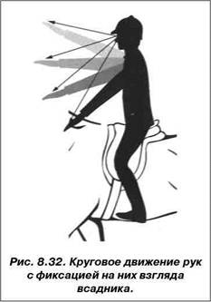 есть ряд упражнений, полезных для исправления этой ситуации. Успешно исправить кивание головой можно при помощи глаз. Круговые движения руками, при которых всадник смотрит на переднюю часть руки, сразу прекращают кивание головой (рис. 8.32). Часто эту проблему также можно устранить, если всадник будет смотреть в одну сторону, фиксируя глазами какую-нибудь точку. Исправить беспокойные руки часто помогает страховочный ремешок на седле, при этом всадник может контролировать себя сам и легко заметить, когда он напрягается неравномерно. Одновременно происходит стабилизация туловища, что является условием для независимого поведения рук. Особенно заметными беспокойные руки становятся на строевой рыси, когда