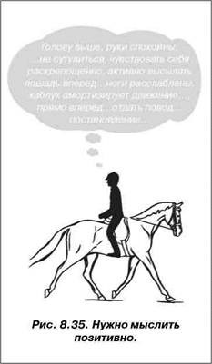 Каблуком, вперед, отдать повод,Расслабиться, посылать, пружинить Быть спокойны, грудь вперед, постановление... исключает глаза — один из важнейших органов чувств — из общего процесса восприятия (рис. 8.33). Для правильного восприятия большое значение имеет то, что всадник держит голову свободно, его взгляд должен быть устремлен поверх ушей лошади в направлении движения. Это очевидно при езде по открытой местности, когда всадник должен замечать встречающиеся на пути неровности почвы. В конкуре взгляд всадника устремляется к следующему препятствию, чтобы правильно оценить дистанцию. Но и в выездке нужно смотреть по сторонам, иначе как можно правильно ориентироваться на четырехугольнике выездкового манежа? В процессе верховой езды очень важно позитивное мышление, человек должен действовать мотивированно. Задание всегда должно казаться выполнимым, никогда нельзя думать о плохом конце. Если же мысли всадника будут идти в негативном направлении, то очевидно, Лео (кличка лошади) не останется ничего другого, как задрать голову вверх (рис. 8.34). Такие мысли фатальны, от них необходимо непременно избавиться и сосредоточиться на позитивном. В приведенном выше примере всадник мог бы подумать: «В следующий раз я заставлю работать наружную ногу лучше» или «в следующий раз лучше выполню внутреннее постановление». Забивать себе голову, думая о многих вещах одновременно, и блокировать себя демотивирующими мыслями — вот типичная ситуация, когда голова мешает правильно ездить верхом (рис. 8.35). Сюда же относится и так называемый эффект демонстрации. Когда всадник хочет особенно хорошо продемонстрировать выполнение какого-либо элемента, то, как правило, ему это не удается. Слишком сильное желание может заблокировать голову таким образом, что восприятие не сможет больше функционировать в реальной ситуации; например, при демонстрации перемены ноги на галопе, лошадь будет галопировать в недостаточной степени сбалансированно и собранно, и всаднику не удастся продемонстрировать желаемый элемент. И, наконец, нельзя недооценивать внутреннее состояние человека. Садясь на лошадь, мы «забираем с собой» всю нашу эмоциональность. Внутреннее душевное состояние определяет наше мышление и движение в целом. Бывают дни, когда чувствуешь, что способен на невозможное, когда для тебя не существует преград и ездишь верхом так, что лучше и желать нельзя. В другие же дни все идет вкривь и вкось. В такие моменты лучше бы совсем не садиться на лошадь. Важную роль играют отношения между тренером и учеником. Есть тренеры, которые могут привести ученика к достижению максимального для него результата. Мой тренер постоянно поправляет меня до тех пор, пока не отворачивается, бормоча себе под нос: «Лучше не бывает». Так он дает мне понять, что на это занятие он установил свои требования на верхнем пределе. Для меня это является настолько сильной поддержкой, что я делаю над собой усилие и добиваюсь успеха в таких ситуациях, в которых одна непременно потерпела бы поражение. Иногда в процессе подобных занятий удается достичь таких результатов, каких никогда от себя не ожидал. Но мне знаком и обратный «сюжет». Один инструктор как-то презрительно бросил в мой адрес, что я не могу правильно собрать лошадь. С тех пор мне достаточно было лишь увидеть его в дверях манежа, как
