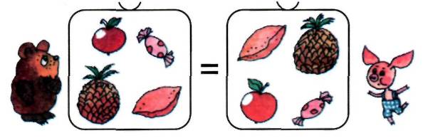 Дед Мороз принес подарки Винни-Пуху и Пятачку. Одинаковы ли их подарки? Обведи красным карандашом знак равенства.