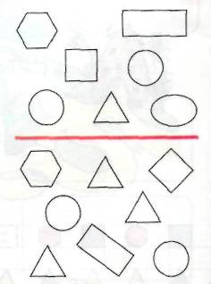 Раскрась жёлтым цветом круги справа от линии, а зелёным — квадраты слева.