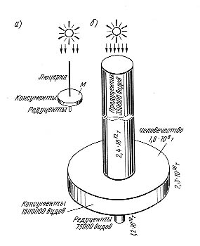 Рис. 3.7. Волчок жизни — схема, иллюстрирующая управляющее и стабилизирующее значение консументов в экосистеме: а — биосфера в целом; б — упрощенная модельная экосистема по Ю. Одуму: люцерна — телята — мальчик (М) с включением других консументов и редуцентов. Диаметр колёс (цилиндров) — число видов, толщина колес (высота цилиндров) — биомасса
