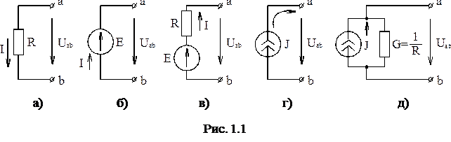 1. Элементы электрической цепи. В электрических цепях постоянного тока есть пассивные и активные элементы. Пассивный линейный элемент – резистор, имеющий электрическое сопротивление R (рис. 1.1а). Ток I и напряжение Uab электрического сопротивления связаны законом Ома: