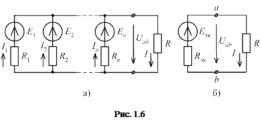 Замена нескольких соединенных параллельно источников ЭДС одним эквивалентным. Если имеется несколько источников ЭДС Е 1, Е 2,..., Еn с внутренними сопротивлениями R 1, R 2,..., Rn, работающих параллельно на общее сопротивление нагрузки R (рис. 1.6а), то они могут быть заменены одним эквивалентным источником ЭДС, с внутренним сопротивлением R эк (рис. 1.6б).