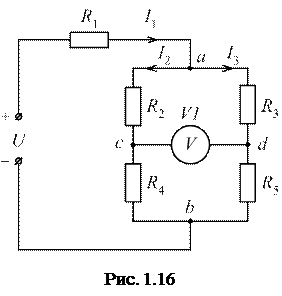 В цепи (рис. 1.16) R 1=10 Ом, R 2= R 3= R 5=25 Ом, R 4=50 Ом, U =120 В.Определить токи в ветвях цепи и показание вольтметра, включенного между точками c и d, считая, что его сопротивление во много раз превышает сопротивление каждого из элементов цепи. Показать, что если R 2/ R 4= R 3/ R 5, то показание вольтметра V1 равно нулю.