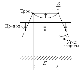 В электроустановках тросы используются в основном для защиты проводов ЛЭП. Разница высот между тросом и проводом составляет меньше 0,2 h, поэтому пользуются не зонами защиты, а углами защиты (рис. 1.29). Угол защиты тросового молниеотвода – это угол между вертикалью, проходящей через трос, и линией, проходящей через трос и провод. Оптимальный угол защиты 20–25º, при меньшем угле может оказаться незащищенным центральный провод.