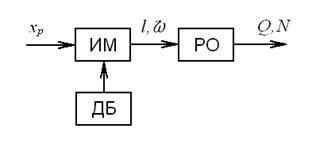 хр- командный сигнал информации; l, ω - линейное и угловое перемещения; Q, N - относительный расход вещества или энергии через ОУ. ДБ - дополнительные блоки.