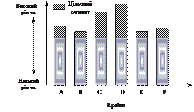 Розрізняють такі підходи: · ідентифікація кластерів країн з попитом на подібні товари; · ідентифікація сегментів, що є у всіх чи багатьох країнах; · вихід на різні сегменти в різних країнах з тим самим товаром. Перший підхід адресований до групи країн, однорідних в економічному і культурному плані. Багато товарів не мають потреби в значній модифікації стосовно до кожної країни Вони відповідають чеканням покупців із країн з подібними кліматичними, мовними, комерційними й інформаційними умовами. Обмеження даного підходу: · його засновано на характеристиках країн, а не на особливостях покупців; · він припускає високу однорідність у межах обраних країн, що рідко має місце; · він зневажає можливістю існування однорідних споживчих сегментів за межами обраних країн. Регіоналізм у Європі робить даний варіант малоефективним, тому що зі зникненням європейських границь фірми визначають заново свій географічний ринок, абстрагуючись від країн і роблячи акцент на природних зонах комерційного інтересу. Глобалізація світової економіки приведе до прийняття і розуміння в масштабах світового ринку багатьох товарів і торгових марок (аудіо- і відеоапаратура, автомобілі, косметика, напої). Їх купують групи покупців, що є у всіх країнах. Отже, покупці з однаковими потребами в кожній країні створюють універсальні сегменти (рис. 5.1) [2]. Маркетингова програма стратегії такого типу практично однакова для всіх країн. Розмір сегмента в окремо узятій країні може бути невеликим, але загальний обсяг привабливим.
