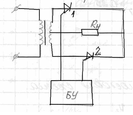 Как и диоды, тиристоры обладают односторонней проводимостью и могут находиться в двух состояниях открытом(прямое включение) и закрытом(обратное). Переменное напряжение снимаеться с обмотки.Если управляющим импульсом открыть тиристоры во время положительных напряжений то ток через нагрузку будет протекать в одном напрвлении.При измининии фазы импульсов изменяеться длительность работы тиристора,а следовательно и величина напряжения на нагрузке. Регулированиие осуществляеться измением угла –а от 0 до 180.