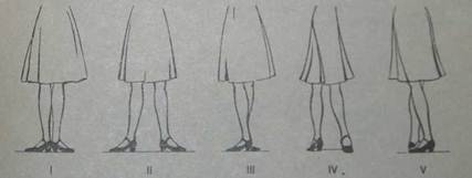 Свободные позиции: Во всех пяти свободных позициях ноги поставлены так, что стопы находятся в направлении между соответствующими открытыми и прямыми позициями. Во всех перечисленных позициях тяжесть корпуса распределена равномерно на обе ноги, ноги в коленях вятянуты.