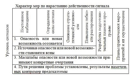 По сильному сигналу предприятие может действовать решительно, например, прекратить дальнейшее наращивание мощностей и переориентироваться на использование их по другому назначению. Ответная реакция на слабый сигнал может быть растянута во времени и усиливаться по мере нарастания сигнала. Из схемы видно, что при наличии неточных признаков опасности (уровень 1) необходимо постоянное наблюдение за внешней средой и определение относительной силы сигнала. Когда источники опасности или новой возможности становятся ясны (уровень 2), принимаются меры к снижению внешней стратегической уязвимости и повышению внутренней гибкости предприятия (например, в случае угрозы снижения спроса из-за создания товара–заменителя разрабатываются предварительные меры по уходу на другой рынок, расширению ассортимента и т.д.). Дальнейшее усиление сигнала (уровень 3) позволяет оценить масштабы опасности (например, спрос на продукцию в краткосрочном периоде будет быстро уменьшаться) или уровень новых возможностей. Такой сигнал свидетельствует о необходимости приступать к разработке подготовительных сигналов, технико-экономическому обоснованию проектов или программ, выполнение которых позволит сократить время реализации практических мероприятий. Наконец, когда сущность проблемы раскрыта, и пути ее решения установлены (уровень 4), разрабатываются планы практических мероприятий и начинается их осуществление. Управление в условиях стратегических неожиданностей. Система чрезвычайных мер при стратегических неожиданностях используется в экстренных ситуациях, возникших внезапно; когда поставлены новые задачи, не соответствующие прошлому опыту и отсутствие решений (например) приводит к крупному ущербу. Эта система предполагает следующие действия: • использование коммутационной сети связей для чрезвычайных ситуаций; Рассмотренные системы (виды) стратегического управления не заменяют друг друга. Каждая из них применяется в определенных условиях, зависящих от степени нестабильности внешней среды. Готовность предприятия к использованию адекватной системы стратегического управления определяется в первую очередь кадровым потенциалом и ресурсами организационной структуры управления. Эффективность управления в условиях стратегических неожиданностей зависит от понимания сути происходящих событий, правильной оценки ситуации, способности руководства вовремя распознать надвигающуюся опасность.