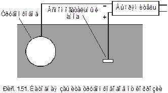 5. Способ катодной защиты внешним током (рис. 1.51) металлических конструкций, судов и магистральных трубопроводов впервые был применен в 1910 году для защиты от коррозии подземных строительных сооружений. Этот способ отличается от метода протекторов тем, что к защищаемой детали подводится отрицательный потенциал от источника питания, а положительный — к вспомогательному аноду.