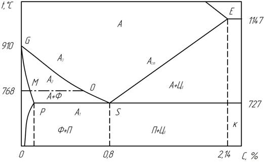 Температуры равновесных превращений (критические точки) принято обозначать буквой А с соответствующим индексом: Эвтектоидную температуру (линия PSK) обозначают А1 (727оС), температуру магнитного превращения А2 (точка Кюри 768оС), температуру линии GS – А3, температуру полиморфного превращения Feγ→Feδ – А4, температуру линии SE – Аcm. Вследствие гистерезиса температуры превращений при нагреве всегда выше соответствующих температур при охлаждении, поэтому введена дополнительная индексация – при нагреве – индекс с, при охлаждении – индекс r.