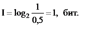 1.2. Количество информации В теории информации количество информации часто измеряют в битах (binary digital), где бит определяется как ценность I информации об исходе двух равновероятных событий. Например, эта информация о том, что сейчас день, а не ночь. Вероятность каждого из событий Р(Д) = 0,5; Р(Н) = 0,5; I = log2 где Р1(х) – апостериорная вероятность; Р2(х) – априорная вероятность. Для примера: