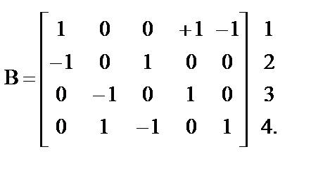 Как видно (см. рис. 3.2), через две (k = 2) смежные дуги можно попасть: из вершины 1 в вершину 4, из 2 в 1, из 2 в 3, из 3 в 4, из 4 в 1 и из 4 в 2. ¨ Таким образом, можно алгоритмически определить, существует ли путь из vi в vj длиной в k дуг. Очевидно, что если число узлов m, максимальная степень k, в которую нужно возвести А для определения самого длинного пути, равна (m – 1). Матрица инцидентности – в общем случае прямоугольная матрица В = {bij},
