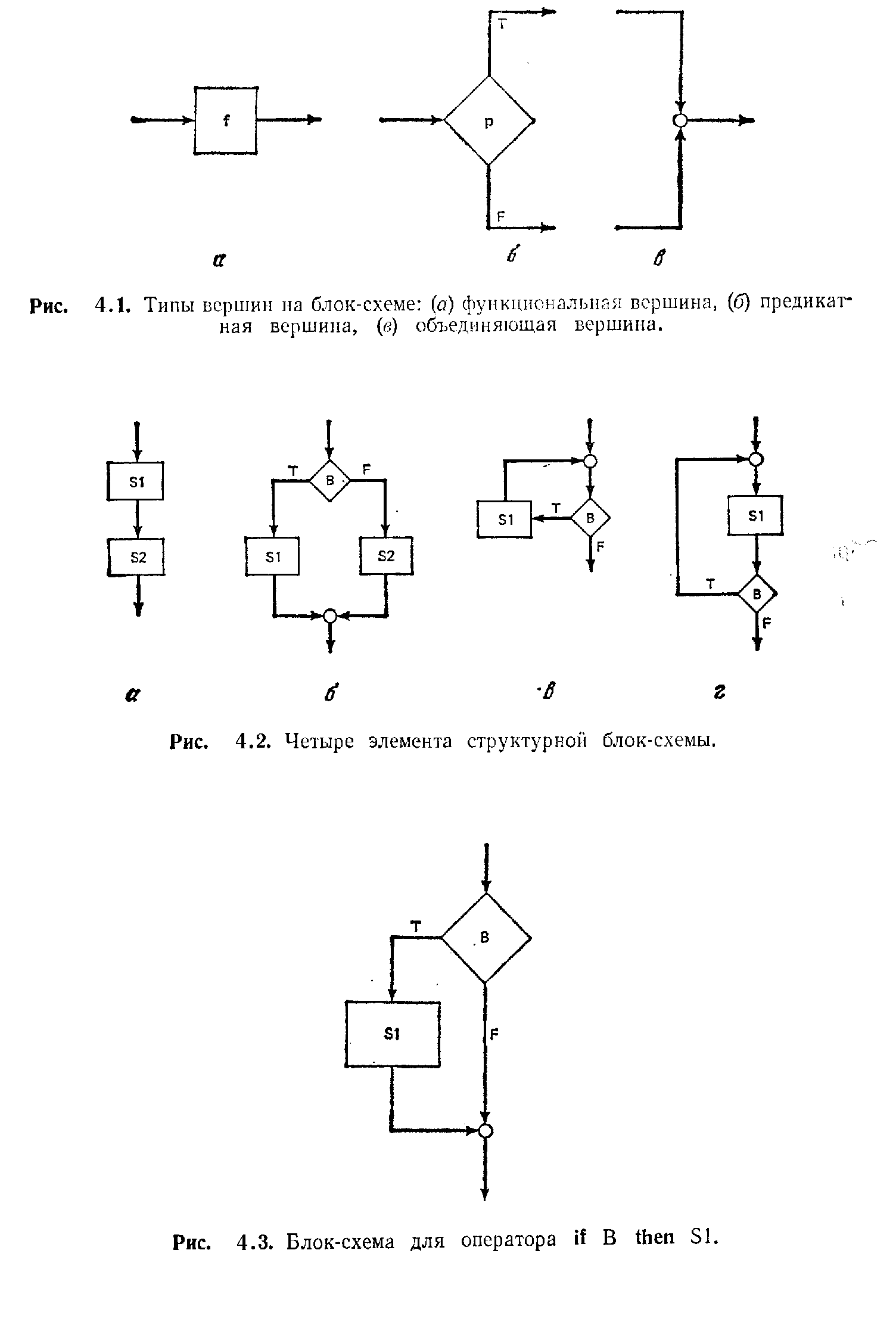 Наше объяснение структурного программирования мы начнем с определения блок-схемы. Блок-схема — это ориентированная сеть, вершины которой могут быть одного из трех типов, представленных на рис. 4.1 Функциональная вершина используется для представления функции F: X-->Y. Предикатная вершина используется для представления функции (или предиката) р: Х-->{Т, F}, т. е. логического выражения, передающего управление по одной из двух возможных ветвей. Объединяющая вершина представляет передачу управления от одной из двух входящих ветвей к одной выходящей ветви. Структурная блок-схема — это блок-схема, которая может быть выражена как композиция из четырех элементарных блок-схем, изображенных на рис. 4.2. Сравнительно просто доказать, что любая программа для вычислительной машины может быть «представлена» блок-схемой. Как было показано Бомом и Якопини, верно (хотя далеко не очевидно) и то, что любая блок-схема может, в свою очередь, быть представлена структурной блок-схемой. Из этого результата немедленно следует, что для разработки любого алгоритма достаточно четырех элементарных блок-схем, приведенных на рис. 4.2. Когда структурная блок-схема служит как представление программы, В интерпретируется как булевское выражение, a S1 и S2интерпретируются как программные операторы (или процедуры). Блок-схемы на рис. 4.2 а, б, в и г называют структурами управления программы. Схема на рис. 4.2 а называется композицией и записывается в виде S1; S2. Схема на рис. 4.2 б называется выбором (или альтернативой) и записывается в виде if В then SI else S2. Блок-схемы на рис. 4.2 в и г называются итерацией (или повторением) и записываются соответственно как while В do S1 и do SI while S. Следует отметить, что часто употребляемый упрощенный оператор if В then Si, блок-схема которого приведена на рис. 4.3, представляет собой частный случай оператора if - then-else.