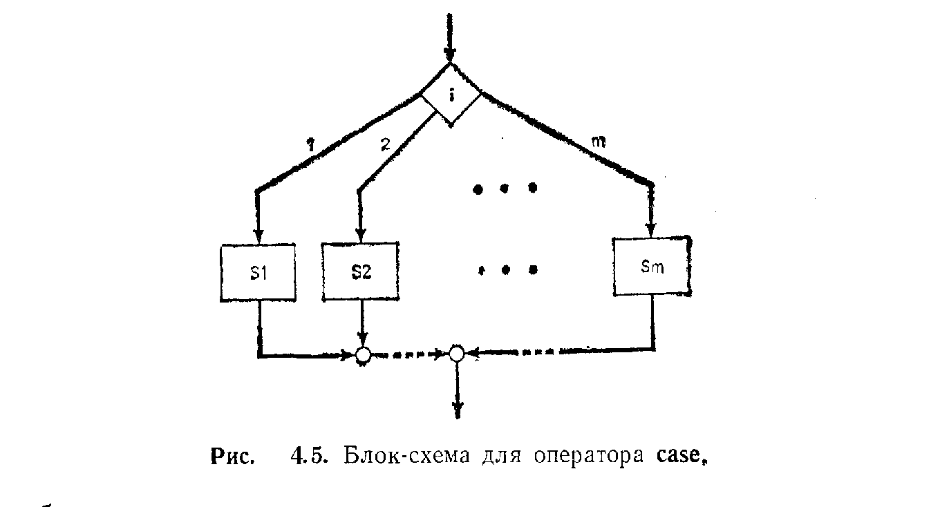 Обратите внимание на то, что в предыдущих блок-схемах совершенно отсутствует оператор goto. Строго говоря, под структурным программированием понимается процесс разработки алгоритмов с помощью структурных блок-схем. Однако в более широком плане структурное программирование допускает большее разнообразие элементарных структур управления, чем те, которые были предложены Бомом и Якопини (т. е. те, которые изображены на рис. 42). Дело в том, что, хотя эта совокупность структур управления достаточна для построения любой программы для вычислительной машины, само построение не обязательно окажется простейшим или наиболее естественным. Проиллюстрируем это на некоторых примерах. Первый пример (рис. 4.5) соответствует ситуации, обрабатываемой на Турбо-Бейсике оператором SELECT... END SELECT. Лингвистически эту блок схему можно выразить в виде: SELECT CASE i CASE i=1: S1 CASE i=2: S2 CASE i=3: S3 ........ CASE i=m: Sm CASE else: S END SELECT. Если же такую конструкцию представить в виде совокупности операторов IF, то можно утонуть в рассуждениях относительно условий пересылки.