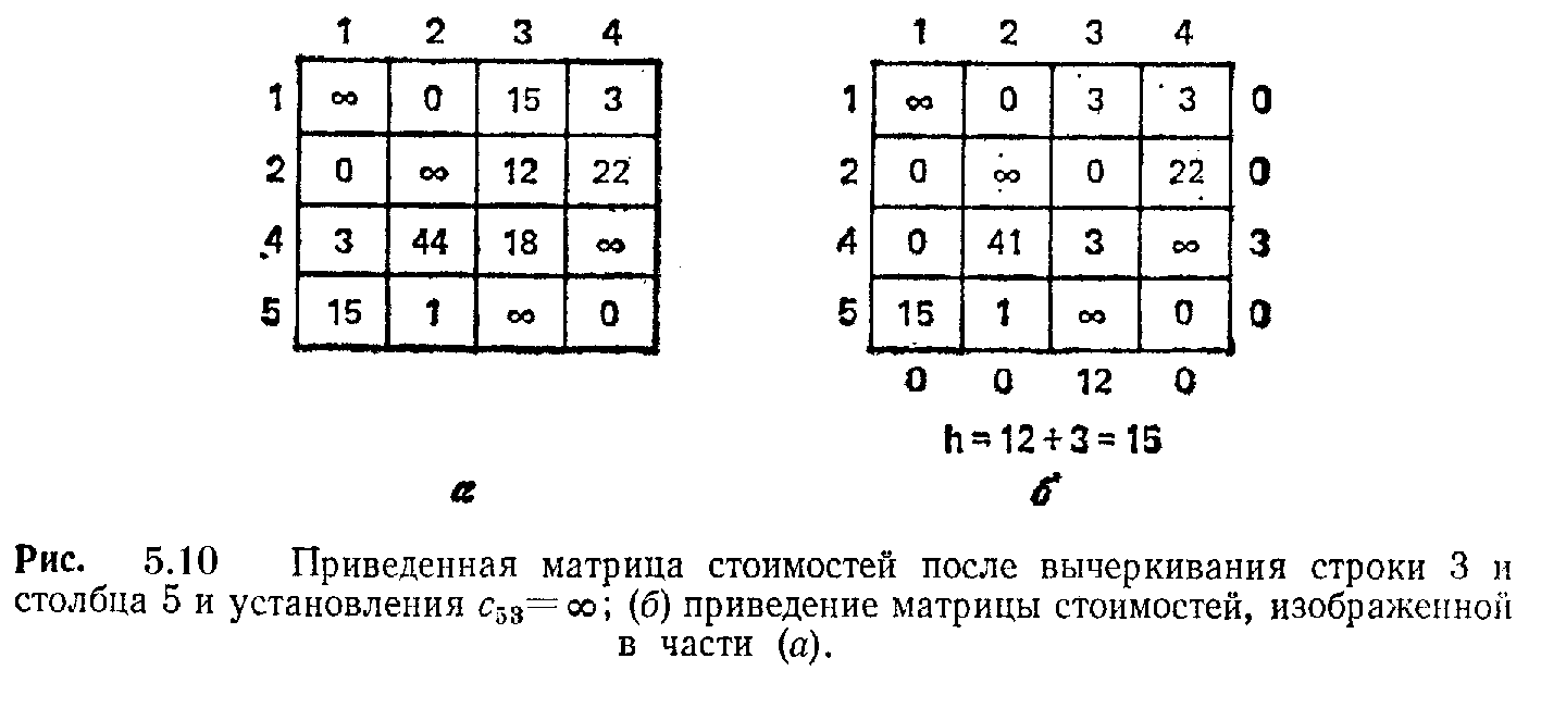По определению ветвления путь (3,5) содержится в каждом туре множества {3,5}, следовательно путь (5,3) в нем не может содержаться, исходя из условий задачи (поездка осуществляется по одному пути только один раз) и, поэтому, значение (5,3) в матрице стоимостей равно бесконечности. Строку 3 и столбец 5 также можно исключить из дальнейшего рассмотрения потому что путь (3,5) уже существует. (строка 3 предполагает выезд из 3, а столбец 5 приезд в 5). Таким образом матрица приведенная на рис. 5.9. может быть нарисована в виде, изображенном на рис. 5.10. На рис.5.10а показана матрица после вычеркивания из нее строки 3 и столбца 5 и соблюдения условия, что стоимость (5,3) равна бесконечности, а на рис.5.10б показана уже приведенная матрица.