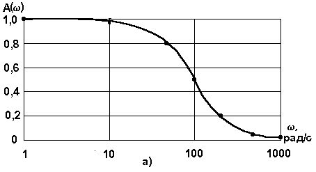 f ( w )=arctg Подставляя значения w в диапазоне от 0 до ¥ в выражения (1.3)...(1.6), рассчитываем U( w ), V( w ), A( w ) и f ( w ) и результаты заносим в табл.3.1. АЧХ, ФЧХ и АФЧХ приведены на рис.3.2. Характеристики удобно построить, отложив частоту в логарифмическом масштабе. Таблица 1.2
