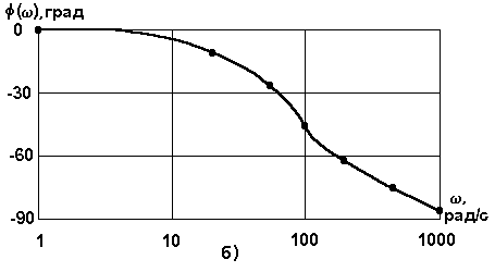 Рис.1.3. Частотные характеристики RC-цепи: а) АЧХ, б) ФЧХ, в) АФЧХ Варианты 1.11...1.20. Найти передаточную функцию соединения звеньев, построить амплитудно-фазовую частотную характеристику. Структурные схемы для различных вариантов приведены на рис.1.4, 1.5, 1.6, а передаточные функции отдельных звеньев - в табл. 1.3. Литература: /1/, с. 70-76.