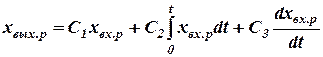 где x вых.р - выходная величина регулятора; xвх.р - его входная величина; C1, C2, C3 - коэффициенты пропорциональности, называемые параметрами настройки регулятора; t - время. Сумма трех составляющих образует ПИД-закон регулирования. При отсутствии отдельных составляющих будут образовываться П-, И-, ПИ-, ПД-законы регулирования. В соответствии с реализуемыми законами регулирования регуляторы непрерывного действия делятся на различные типы. 1. Пропорциональные регуляторы, у которых выходная величина xвых.р связана с входной величиной xвх.р соотношением xвых.р = kрxвх.р, где kр - коэффициент передачи регулятора. Передаточная функция П-регулятора имеет вид Wп(p) = kр. 2. Интегральные регуляторы, у которых изменение выходной величины пропорционально интегралу изменения входной